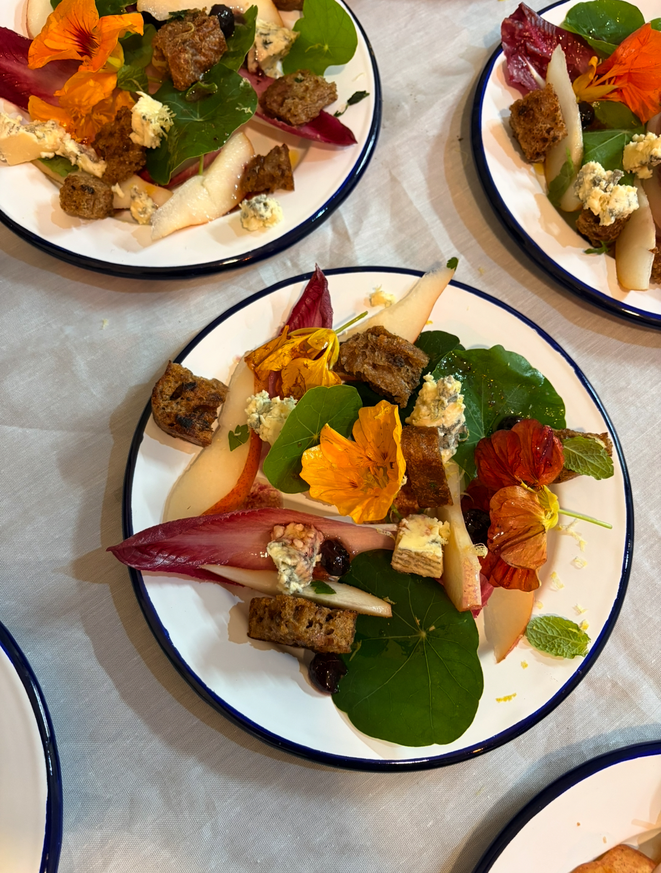 This is a simple but very effective little salad – my favourite kind of salad – that really lets the great-quality ingredients shine through. Its main player is the artisan small-batch cheese, Cashel Blue, made in Tipperary, which is tangy and creamy, and rather unique. It dances along with a really full and earthy sourdough rye bread made into croutons, soft, juicy pears and crisp chicory leaves. This is all pulled together by a sweet dressing, making the most of the fruit we preserve from earlier months in the year (or possibly just buy from Waitrose). This salad was the second course in my October autumnal six-course tasting menu at Stanley Arts Supper Club, South Norwood, and includes nasturtium flowers and leaves because, even into November, they are still going strong in my South East London garden. If you are not an avid nasturtium grower (give it a go; it’s so easy), then some rocket in its place will do nicely.
